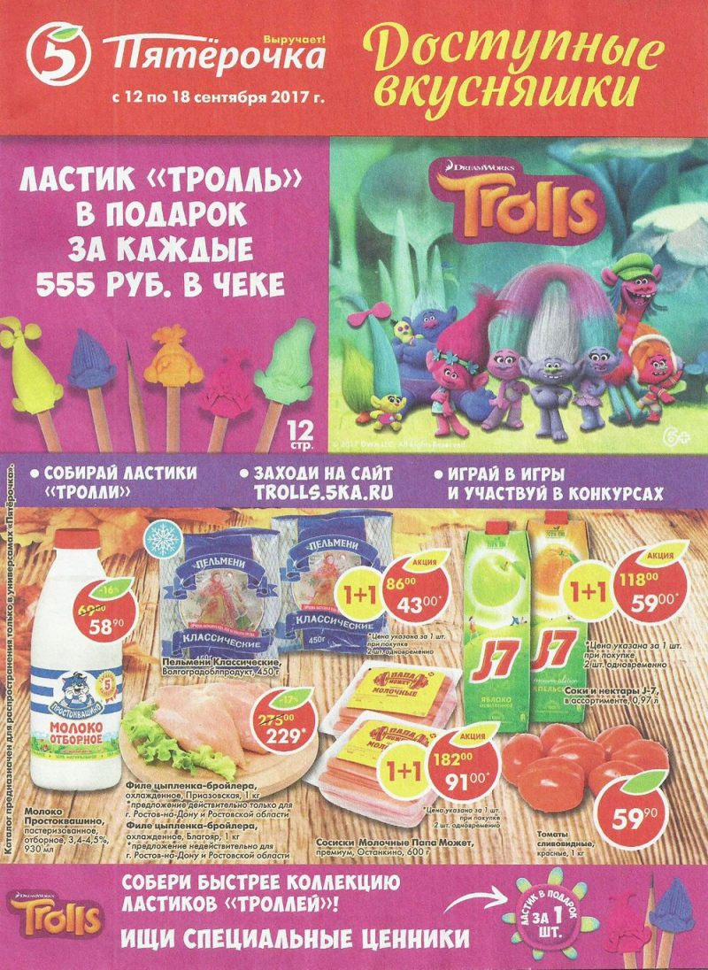 Пятерочка предлагает посмотреть свой еженедельный каталог, который будет действовать с 12 по 18 сентября 2017 года. Новый каталог акций в Ростове-на-Дону предложит вашему вниманию ряд товаров со скидками, которые помогут вам сэкономить.